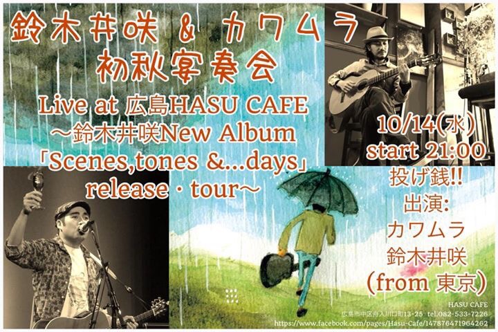Home › Live schedule › 10月14日(水)広島市 投稿日:2015年10月13日 10月14日(水)広島市 Tweet 場所:舟入HASU CAFE(広島市中区舟入川口町13-25) tel.082-533-7226 start:21:00〜 投げ銭ライブ 出演:カワムラ/鈴木 井咲(from 東京) Tweet 前後の投稿 10月10日(土)広島市 湯来町 10月18日(日)岩手 一関